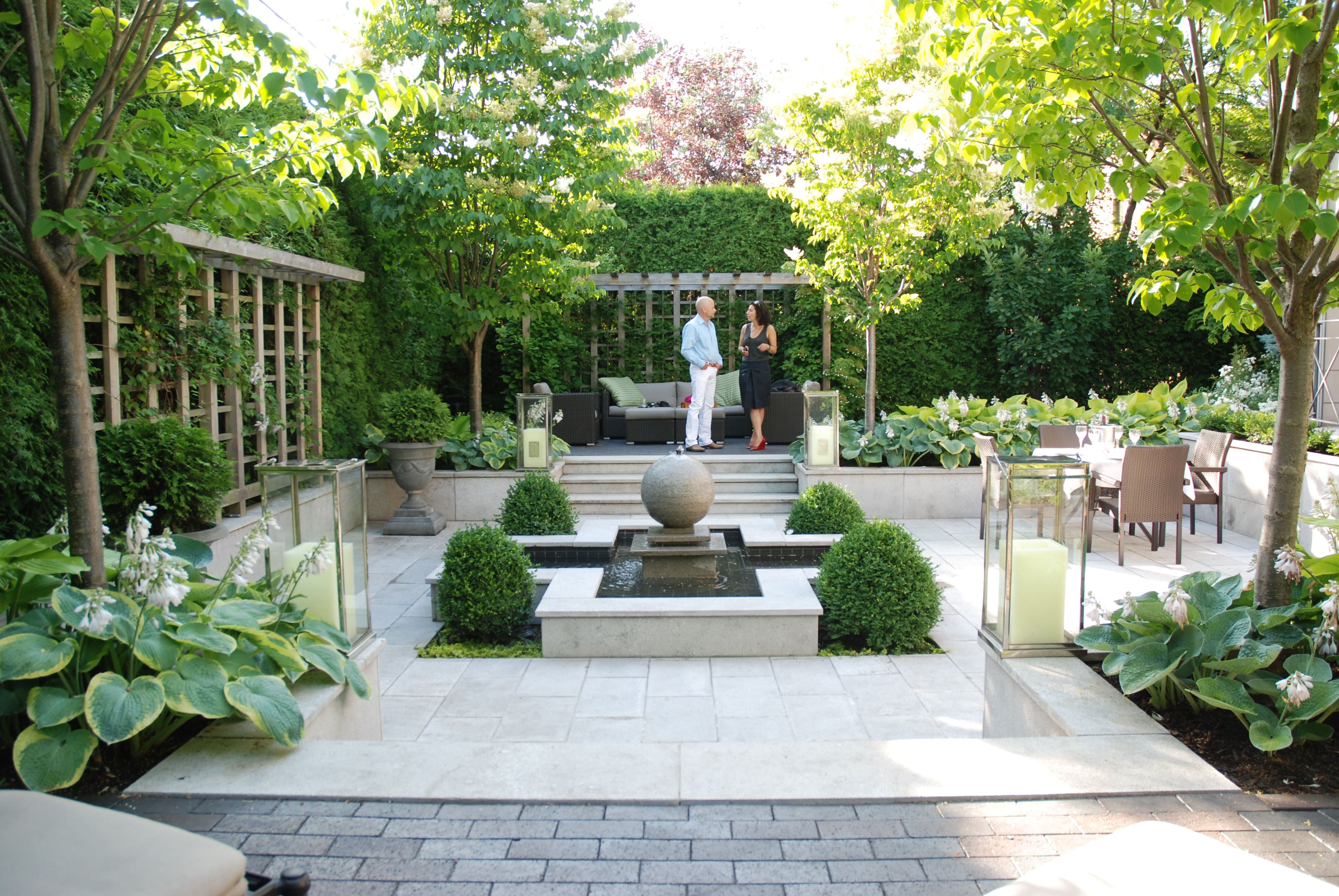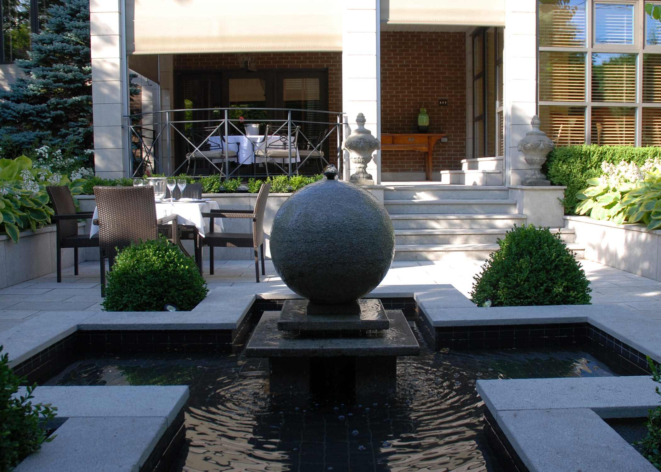 Removing an existing in-ground pool resulted in the unique opportunity to create a garden of multi-level interconnecting terraces. The clean, simple architectural lines of these outdoor rooms extend the house to the edges of the property. The central axis of the garden is a stone fountain which visually connects the spaces.